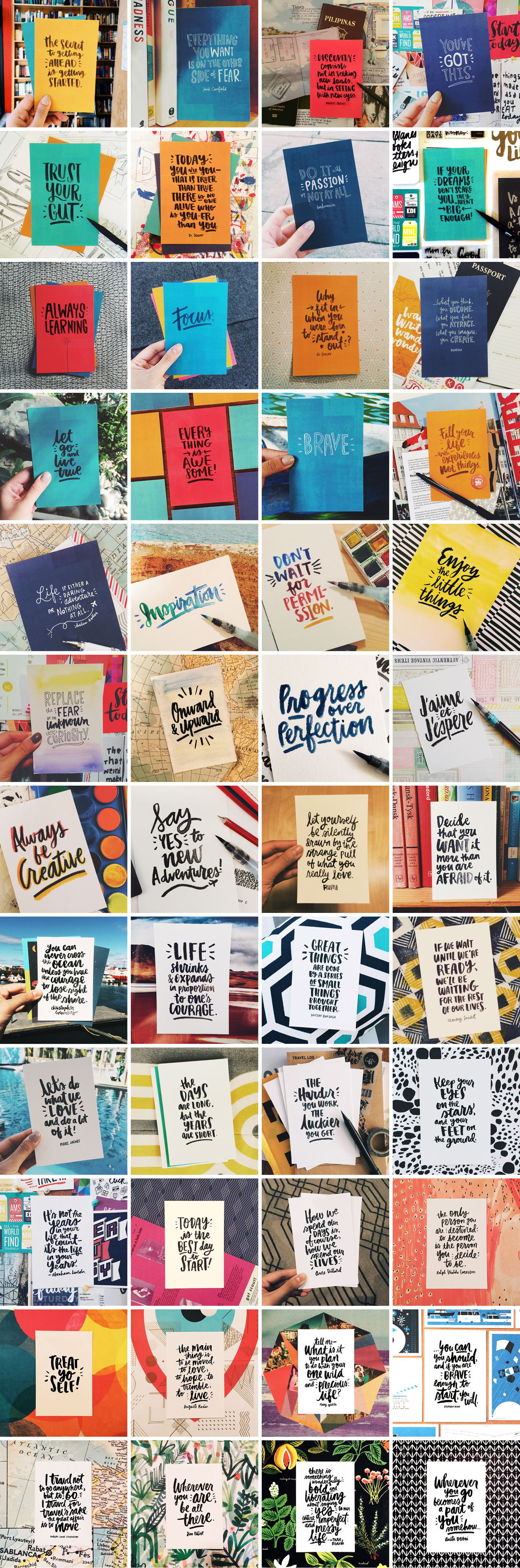 Last March 2015, I decided to embark on a 100-day project: I'd handletter quotes or requested lines onto postcards and physically mail them out to 100 people (through a sign up form on my website). Well, 55 postcards later and I'm in a bit of a squeeze (realizing that while some wanted awesome quotes, some wanted postcards that said, "Beat you to the finish line!" which I felt weren't very... erm, fun to share.) So I've postponed the project, but at least I have 45+ (!) postcards to share!